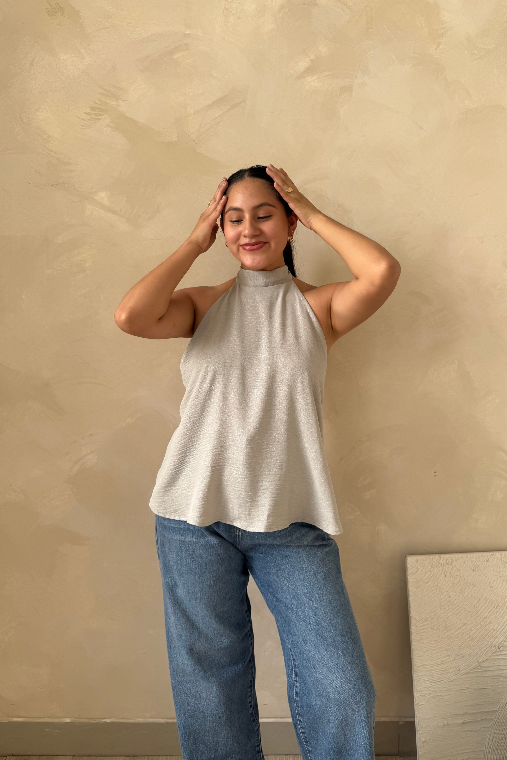 El cuello halter define la parte superior y se ajusta en la parte posterior, dejando la espalda descubierta, un detalle que aporta presencia y la hace ideal para salidas y ocasiones especiales. El diseño cae suelto sobre el cuerpo, sin marcar, creando una silueta equilibrada y estilizada.