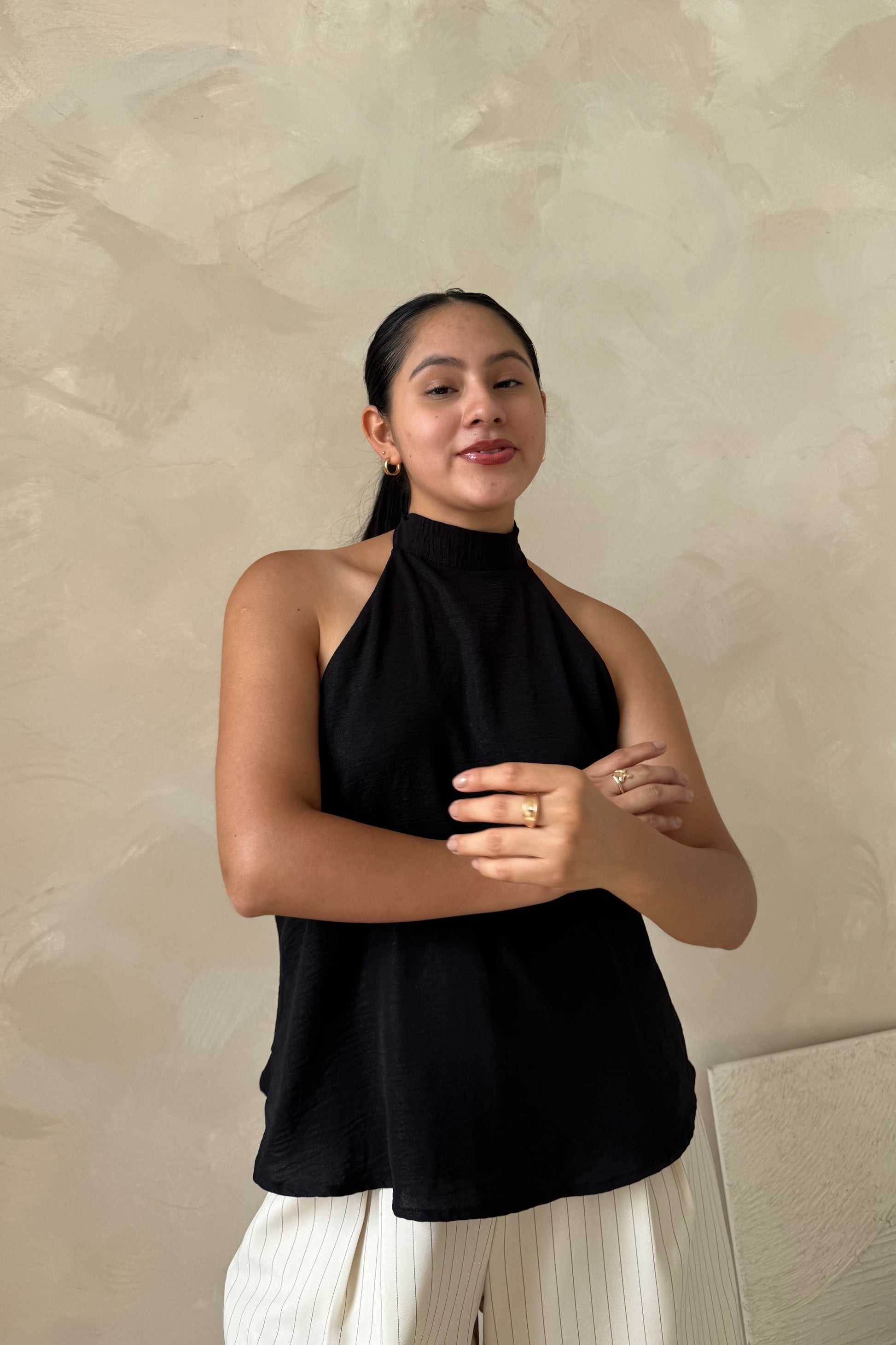El cuello halter define la parte superior y se ajusta en la parte posterior, dejando la espalda descubierta, un detalle que aporta presencia y la hace ideal para salidas y ocasiones especiales. El diseño cae suelto sobre el cuerpo, sin marcar, creando una silueta equilibrada y estilizada.