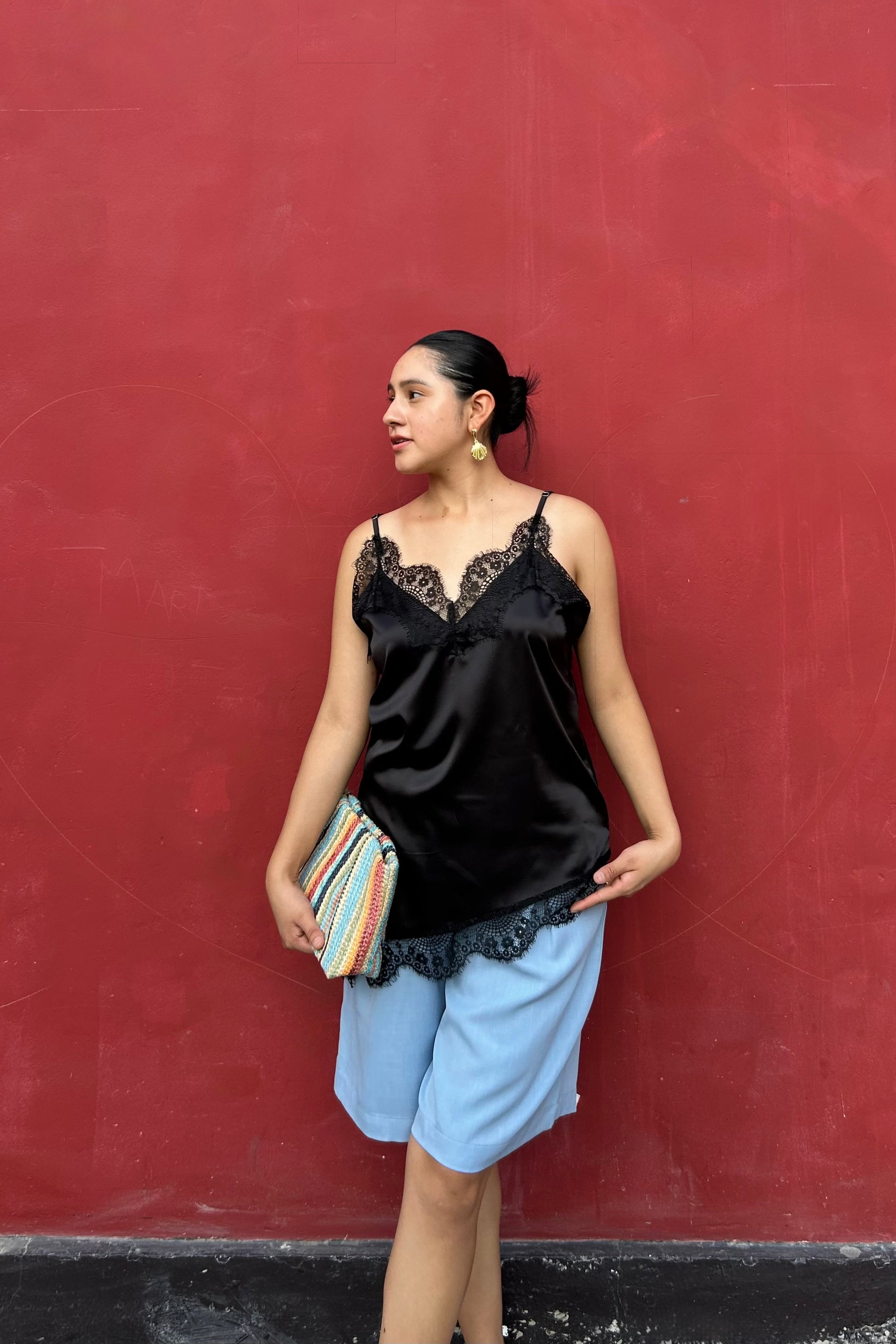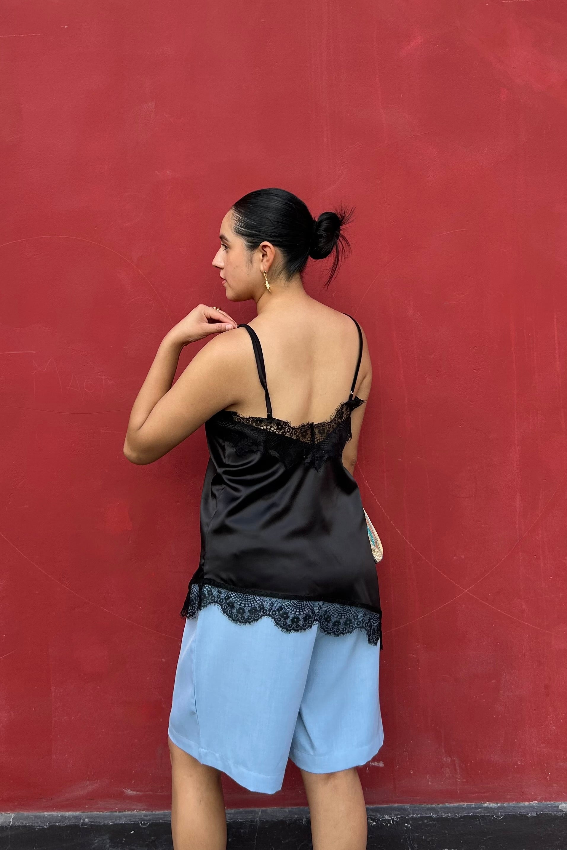 Está elaborada en seda satin de textura suave, con encaje delicado en el escote y en la basta asimétrica, que le aporta un detalle femenino y sutil sin ser recargado.