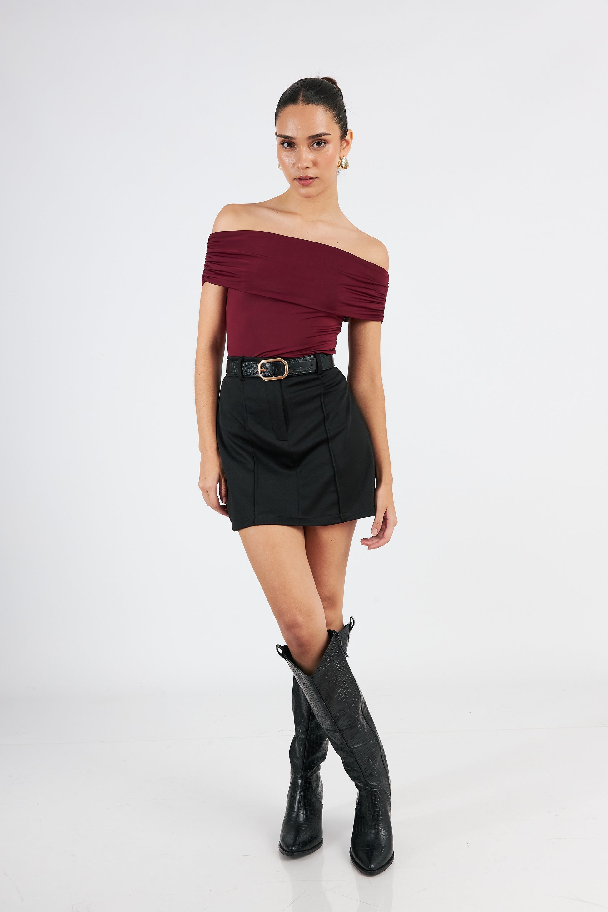 Elaborada en tela venecia, es una prenda ceñida al cuerpo y con un escote off shoulder que le da un toque de elegancia y sofisticación.