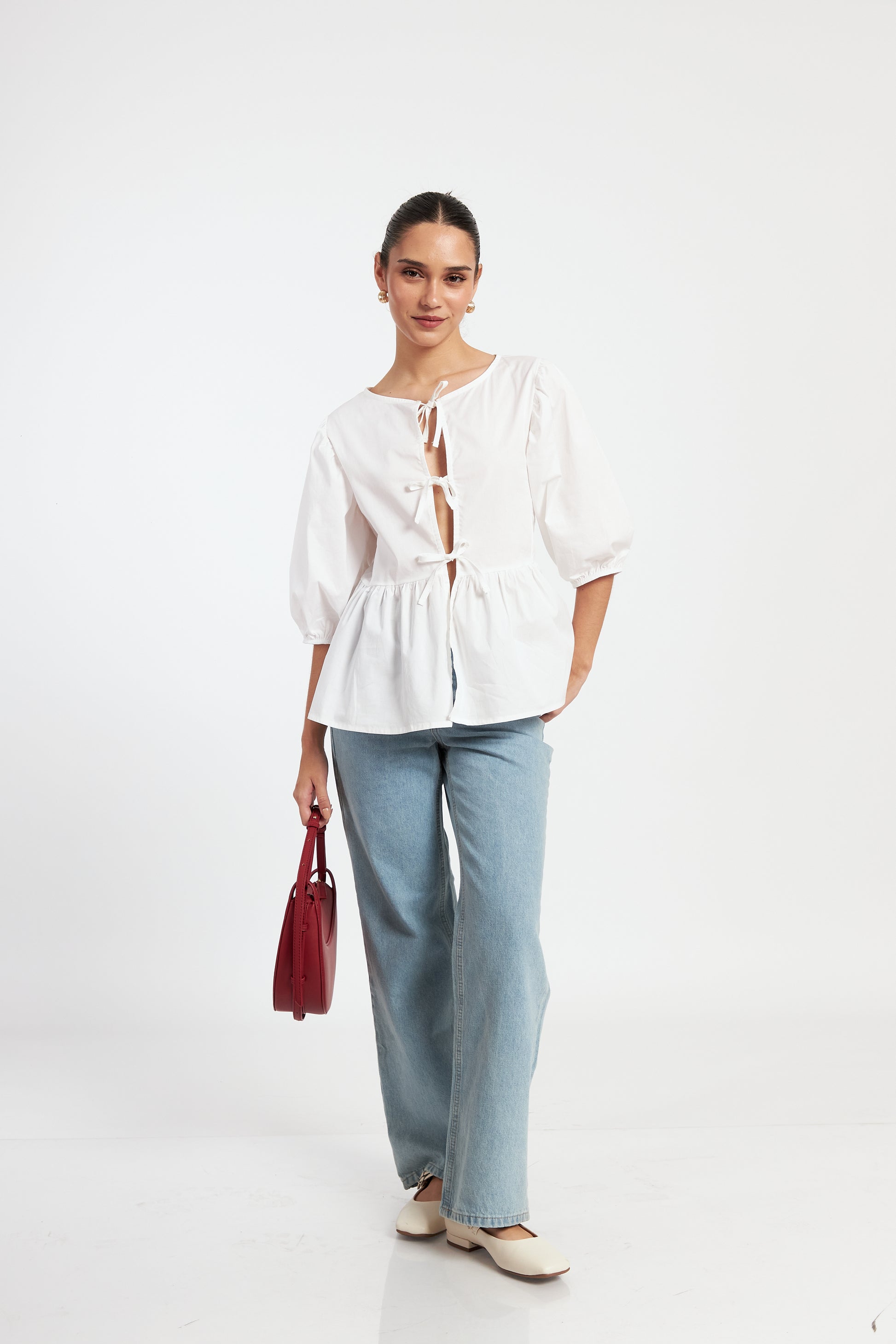 Las mangas abullonadas añaden un toque de sofisticación, mientras que las cintas en el medio te permitiran ajustarla