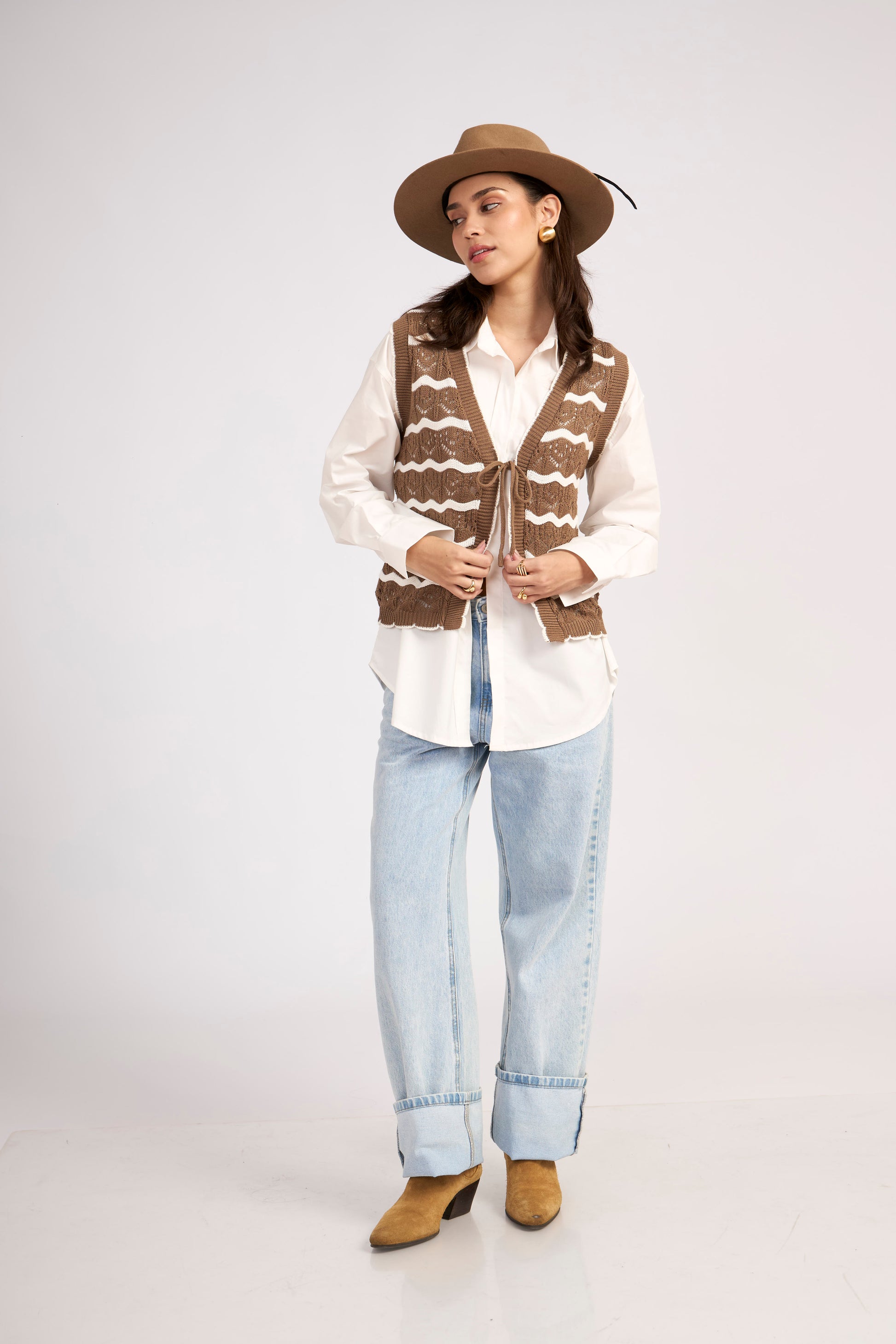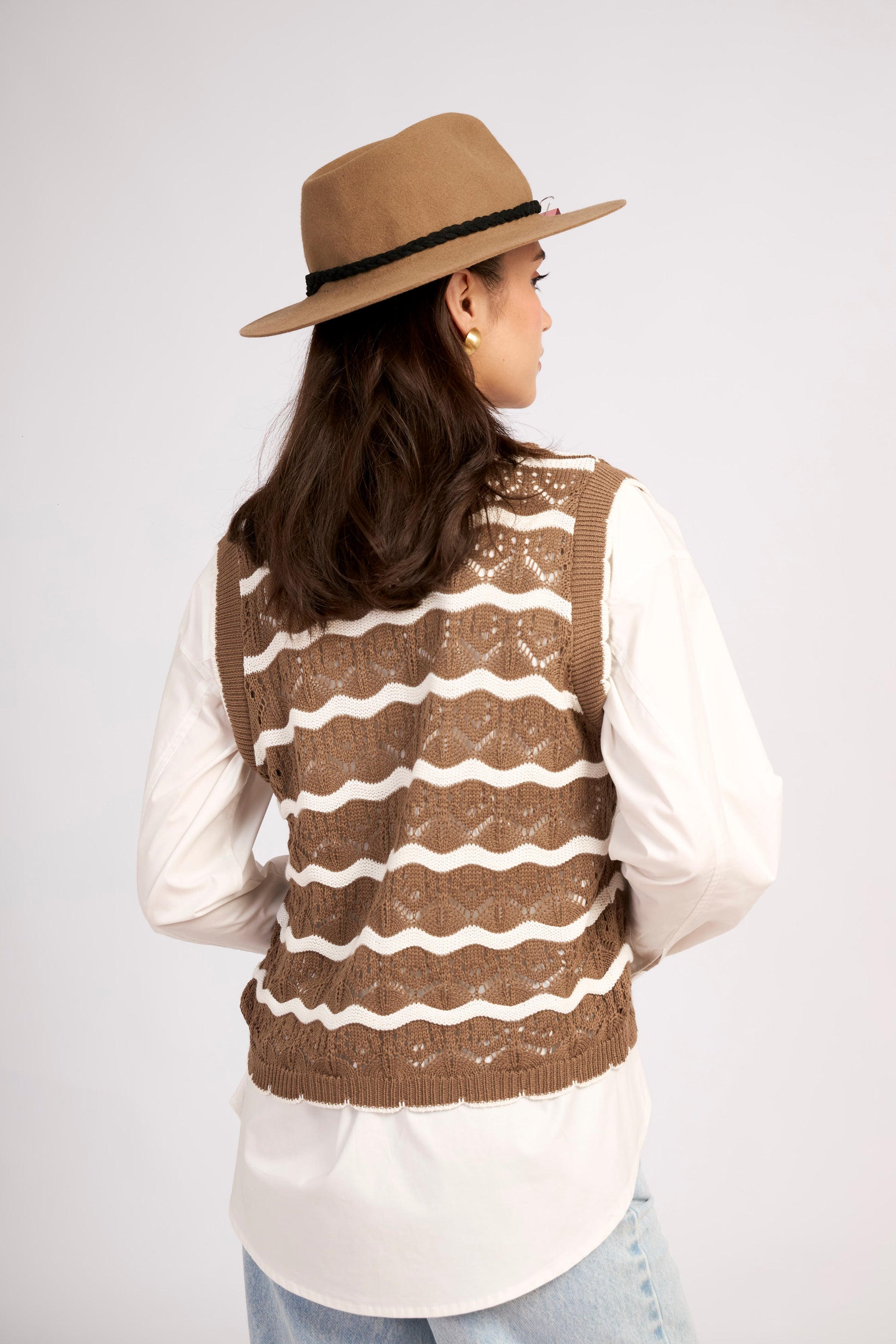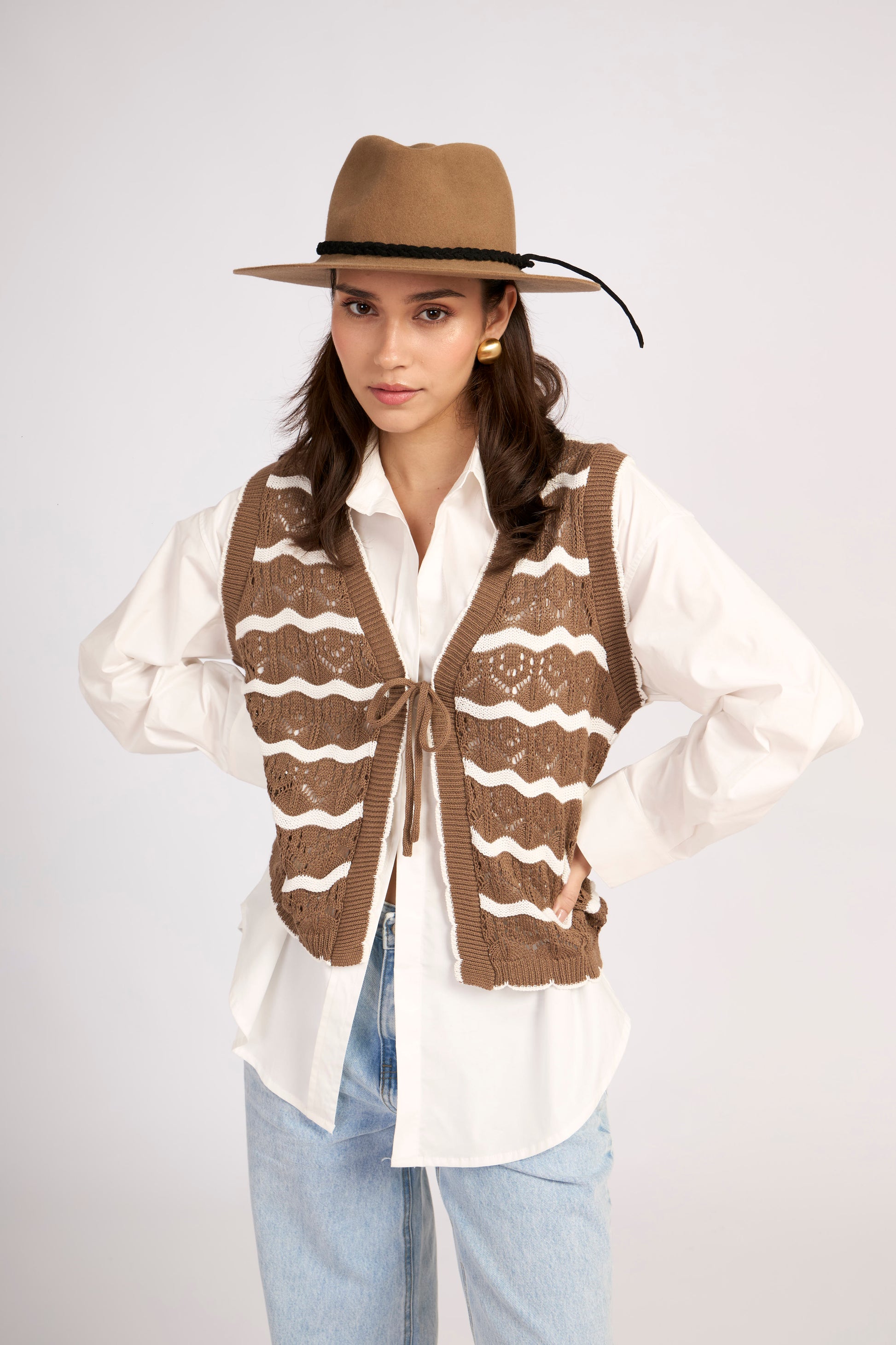 el estilo boho junto al tejido, ¿Porqué no? , cuenta con un diseño de ondas horizontales y unas pitas en el pecho para amarrar.