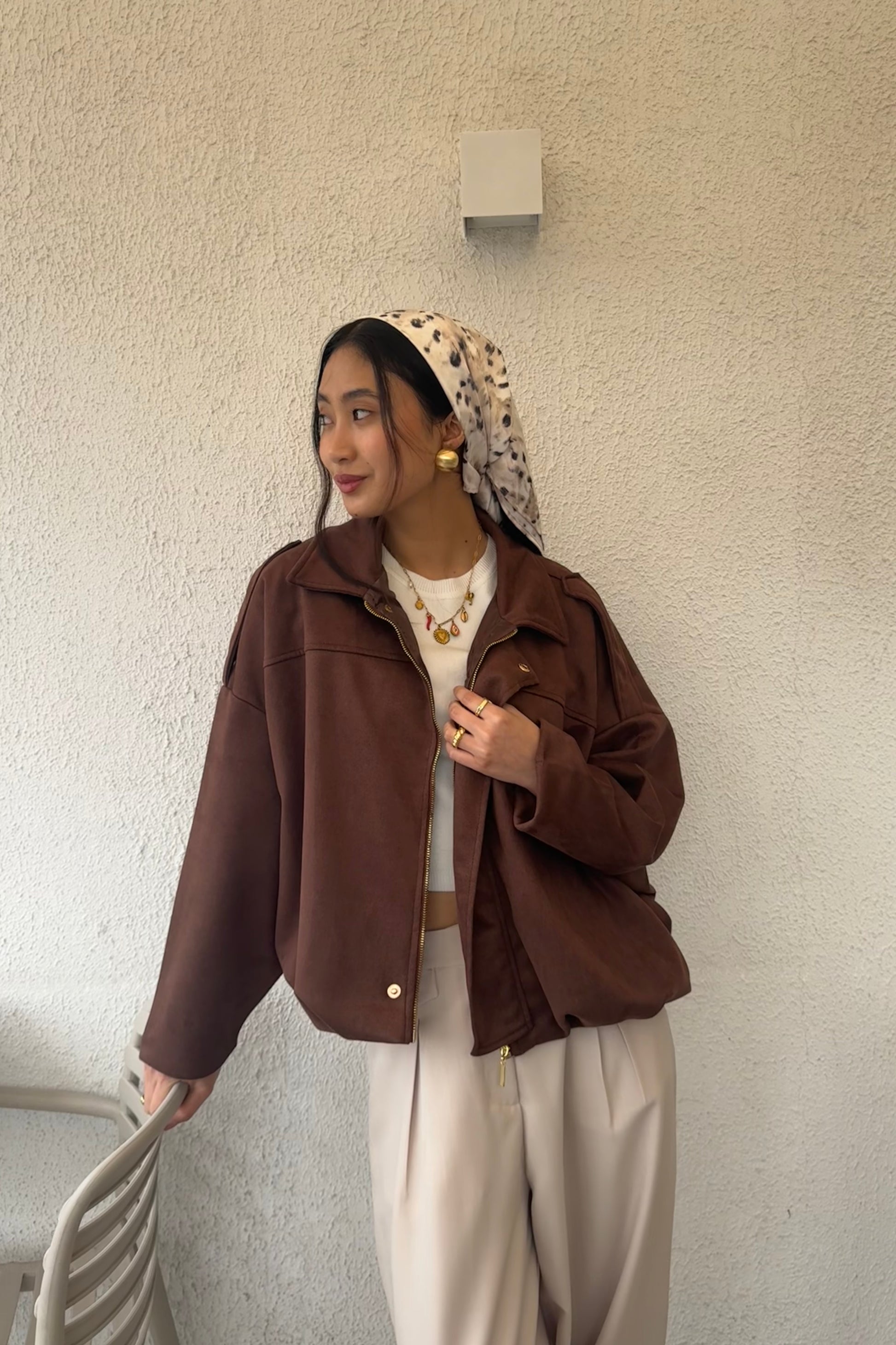 Está confeccionada en suede, con un tacto suave y firme, perfecto para entretiempo.