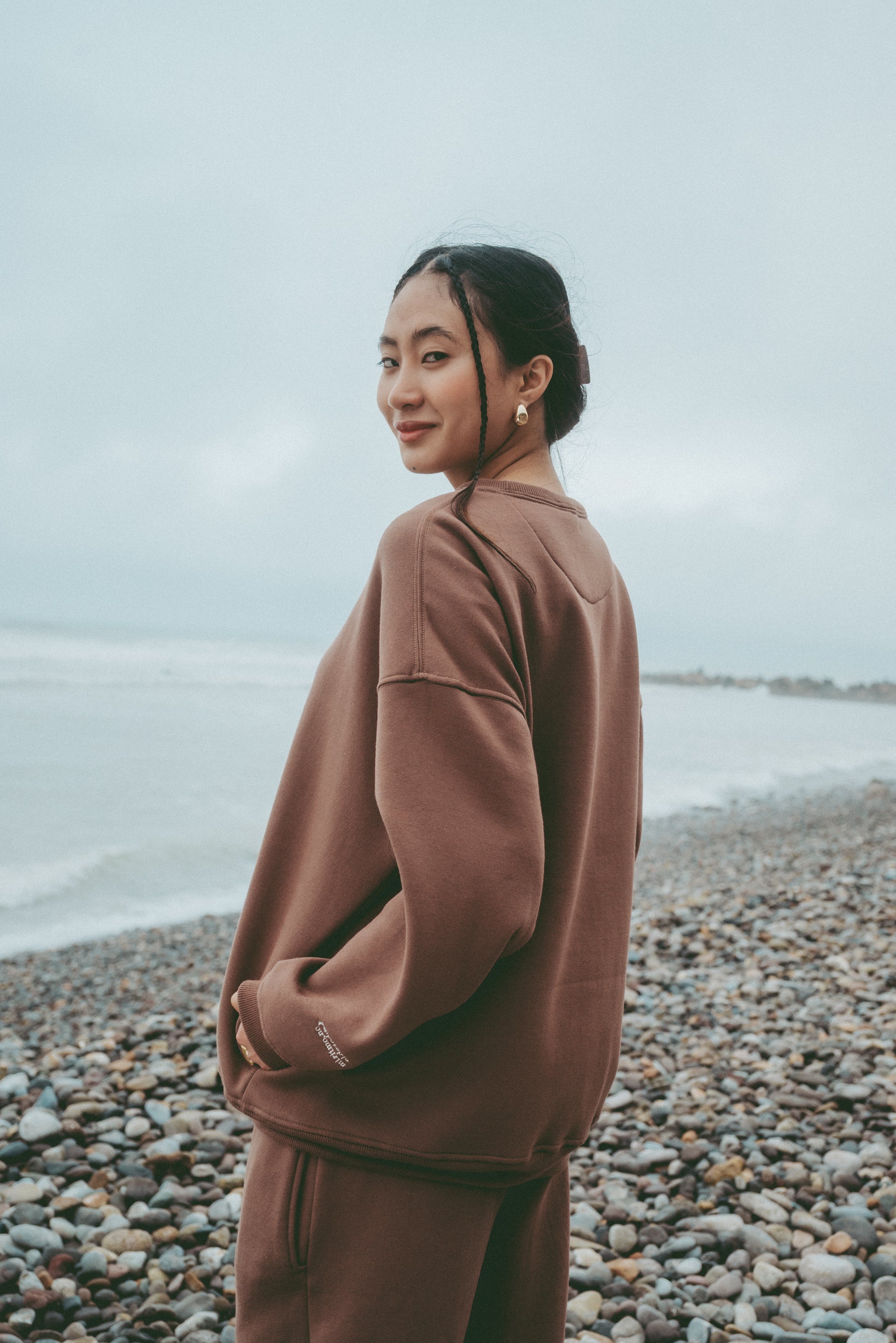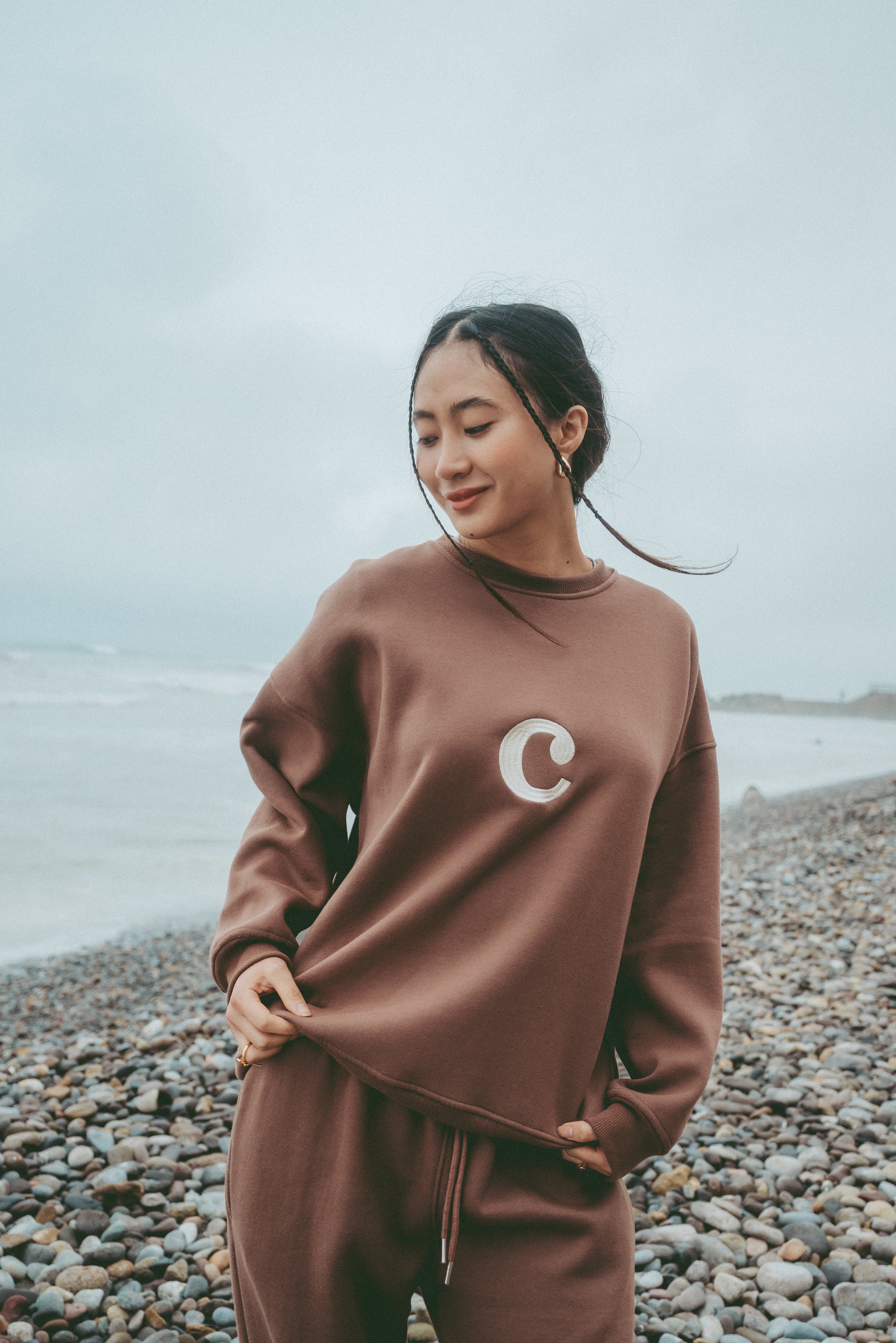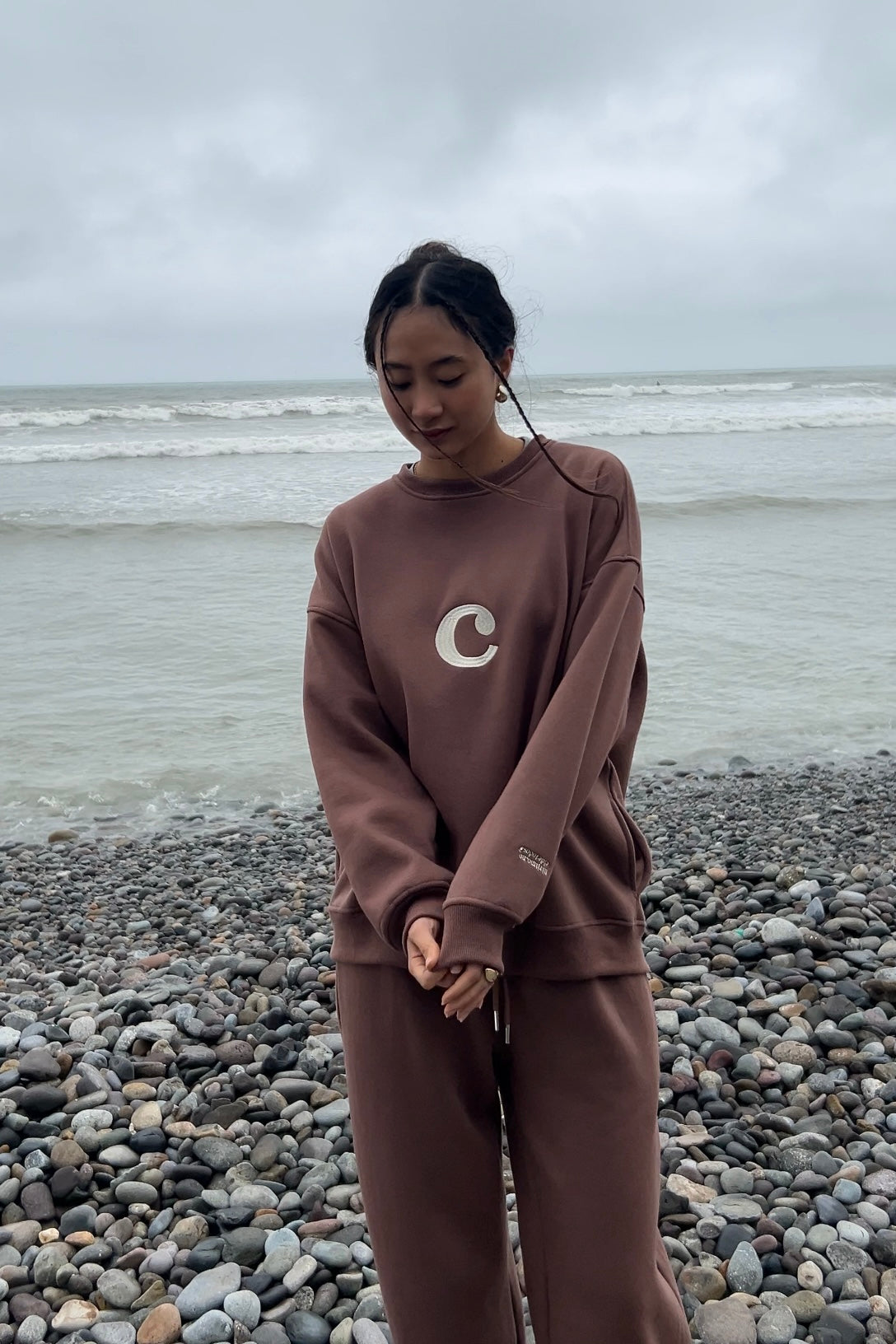 Cuenta con bolsillos laterales, tiene un diseño minimalista y relajado, con cuello redondo y una caída cómoda, pero sin perder forma. En el pecho, lleva un bordado con la letra “C”, y en la manga, una frase que lo dice todo: