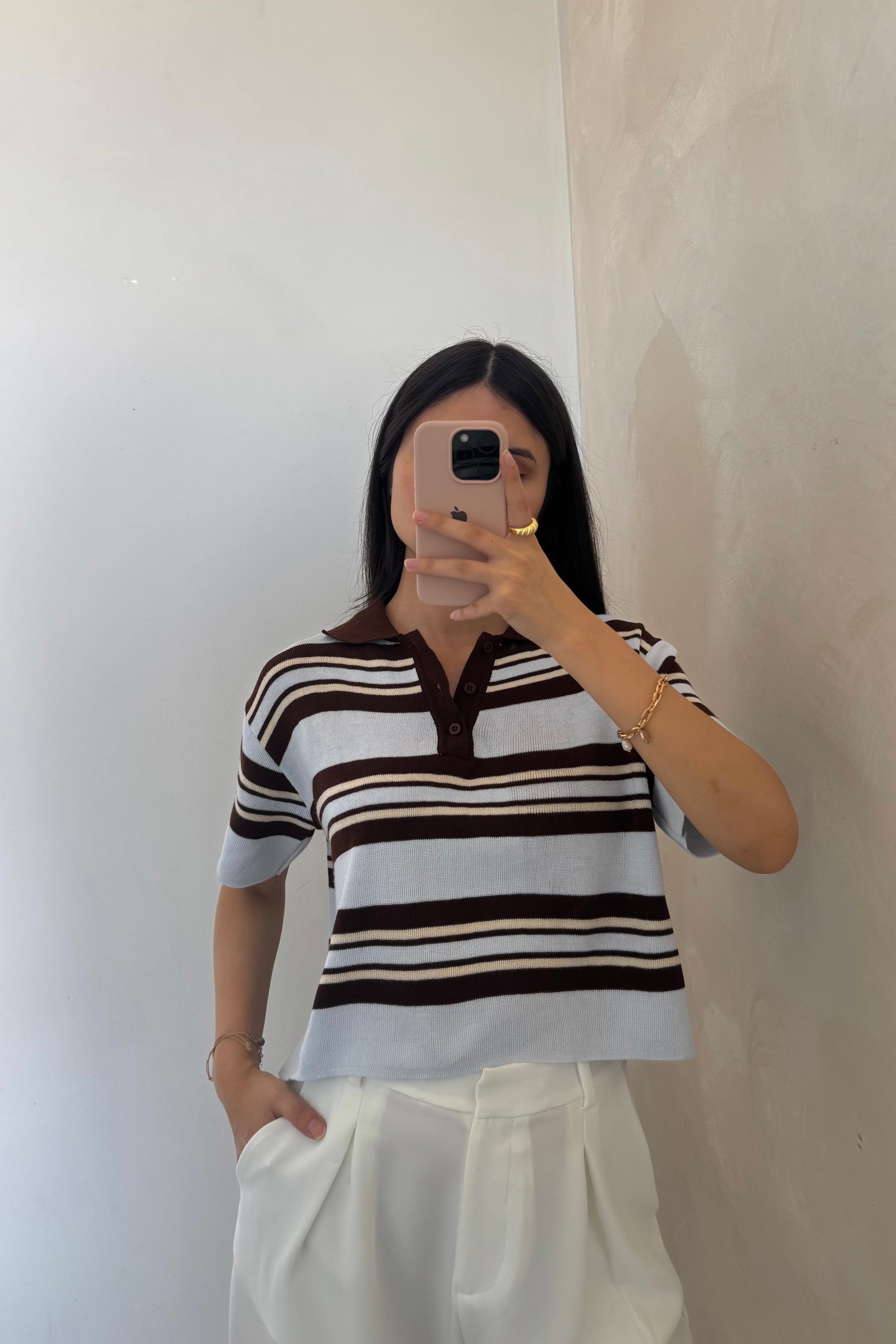 Elaborado en tacto algodón, este polito tejido llega con una de las tendencias más queridas del año: las rayas. La combinación de colores es cálida y versátil, perfecta para esos días donde buscas algo cómodo pero con personalidad.