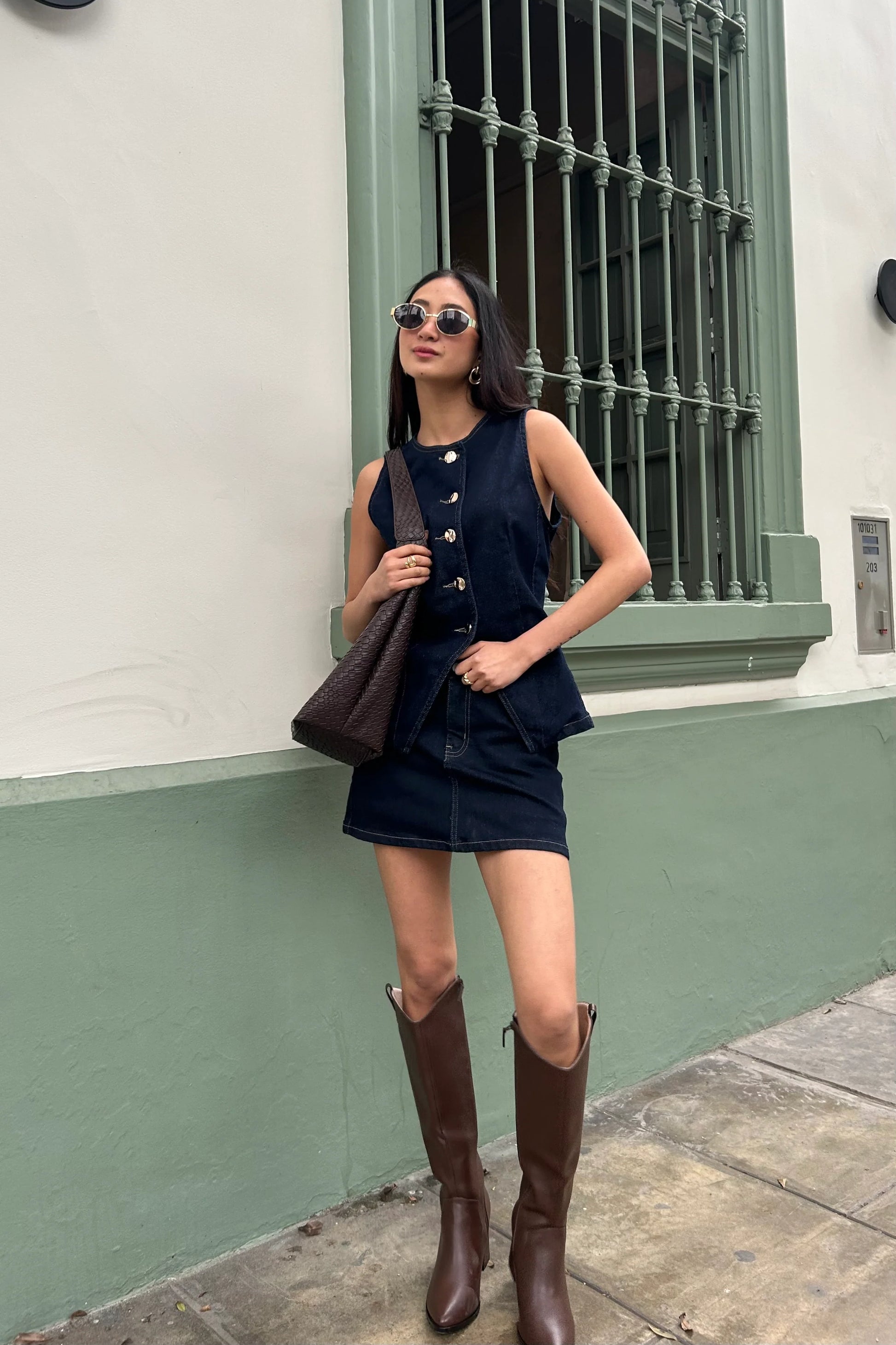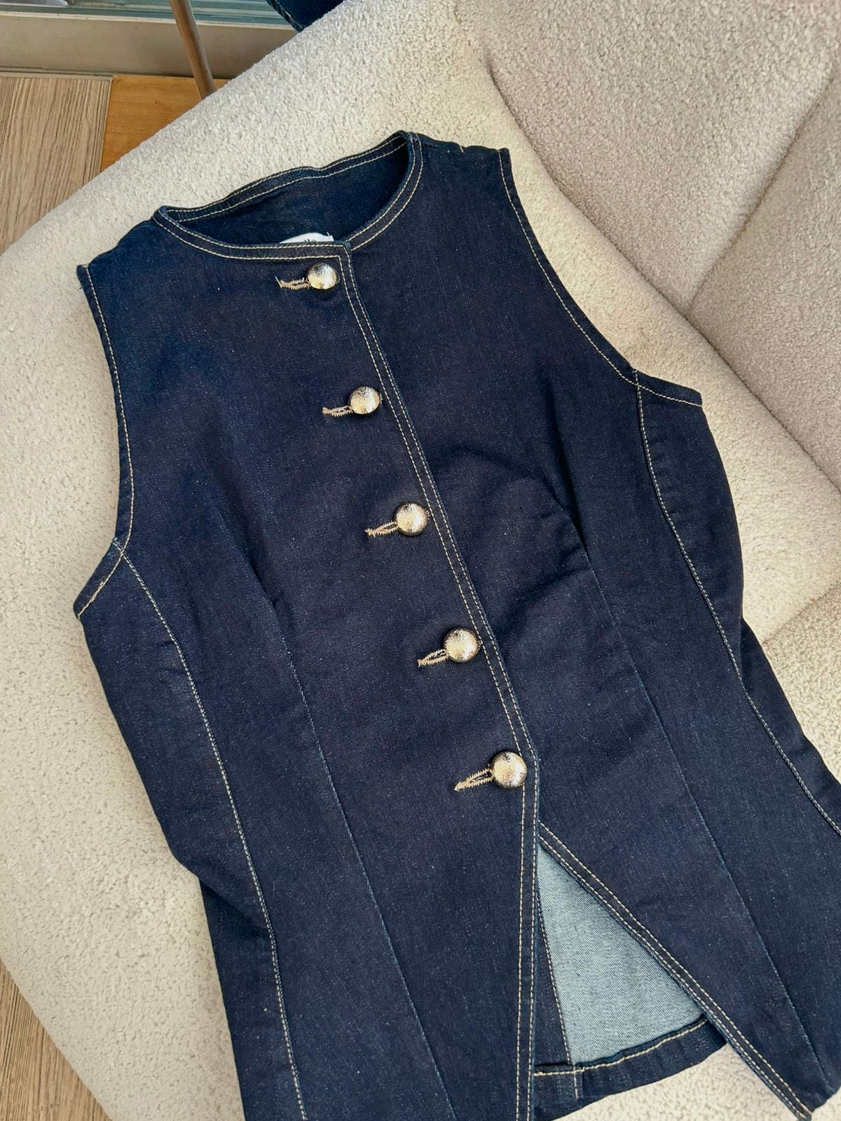 Nuestro chaleco está confeccionado en denim comfort, una tela de algodón con el toque perfecto de elasticidad para adaptarse a tu figura y acompañar cada movimiento.