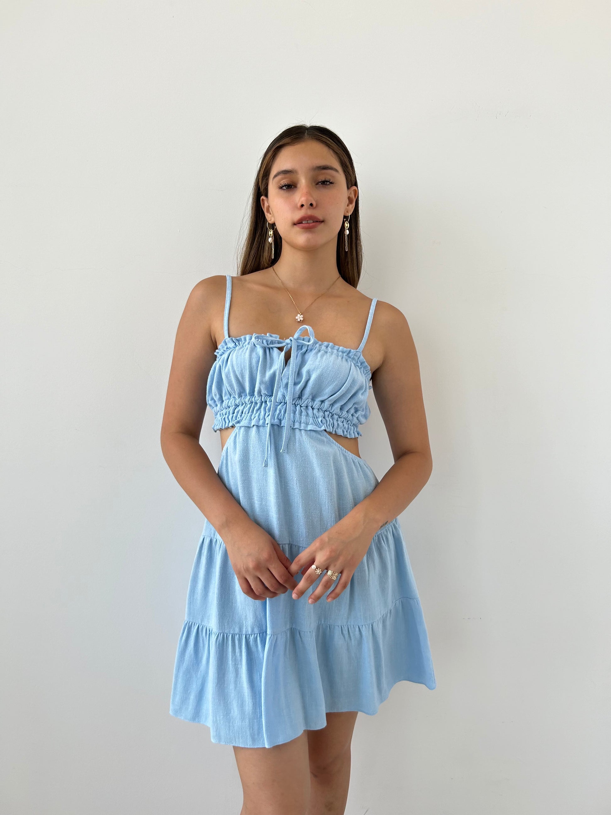 Un vestido con una falda en tiempos, en corte A, con fruncido en la cintura para acentuarla, espalda descubierta, y pitas para poder regularla