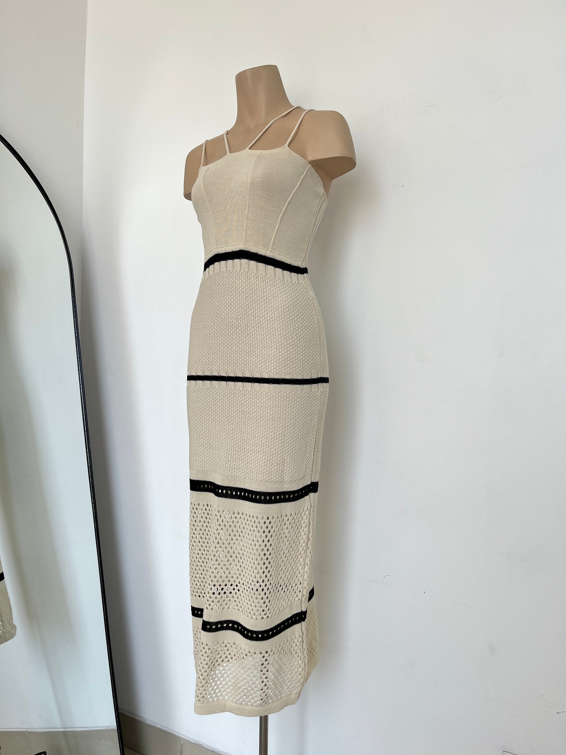 Cuenta con distintos puntos de tejido a lo largo del vestido y un detalle de pitas en el cuello