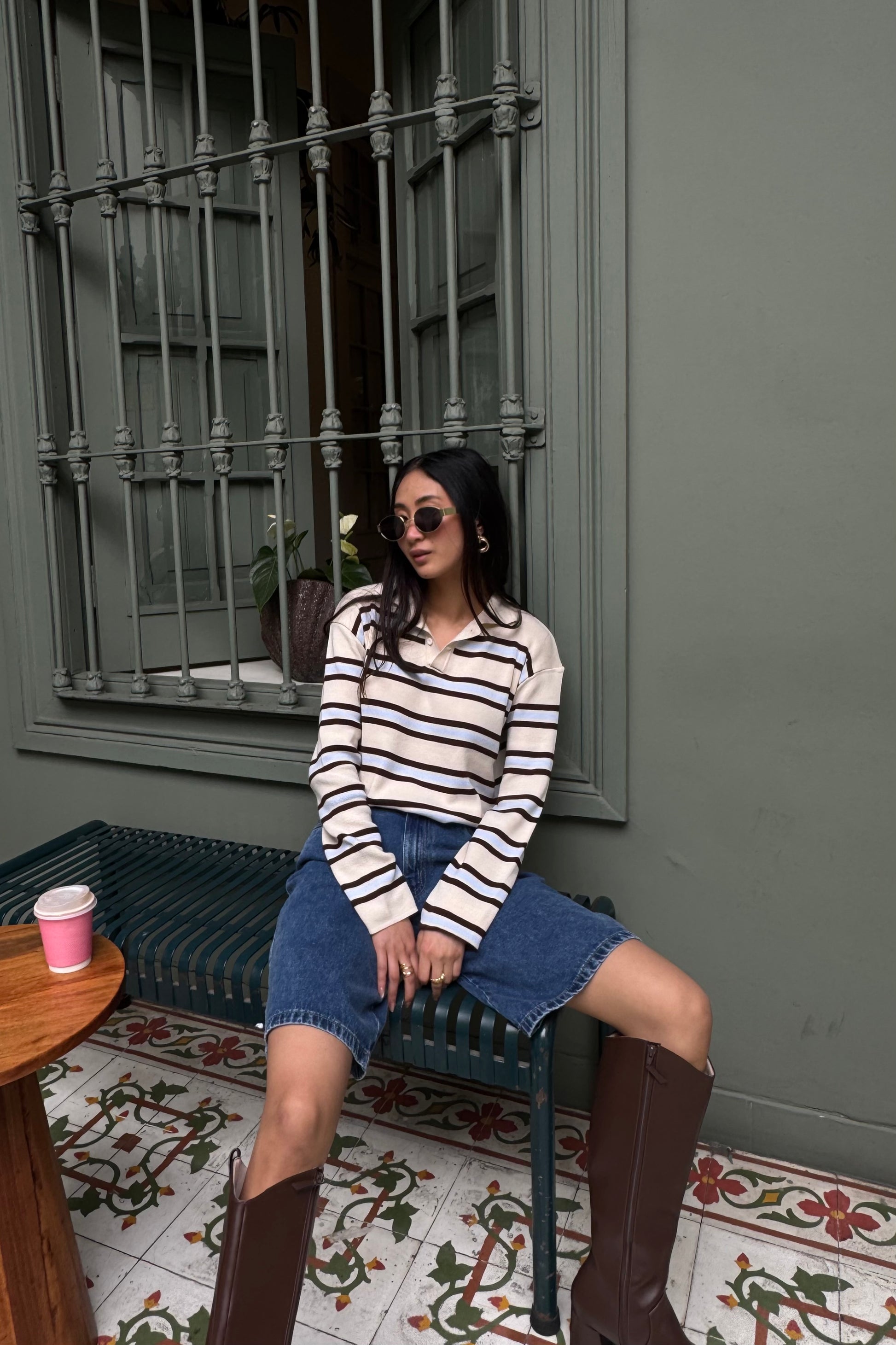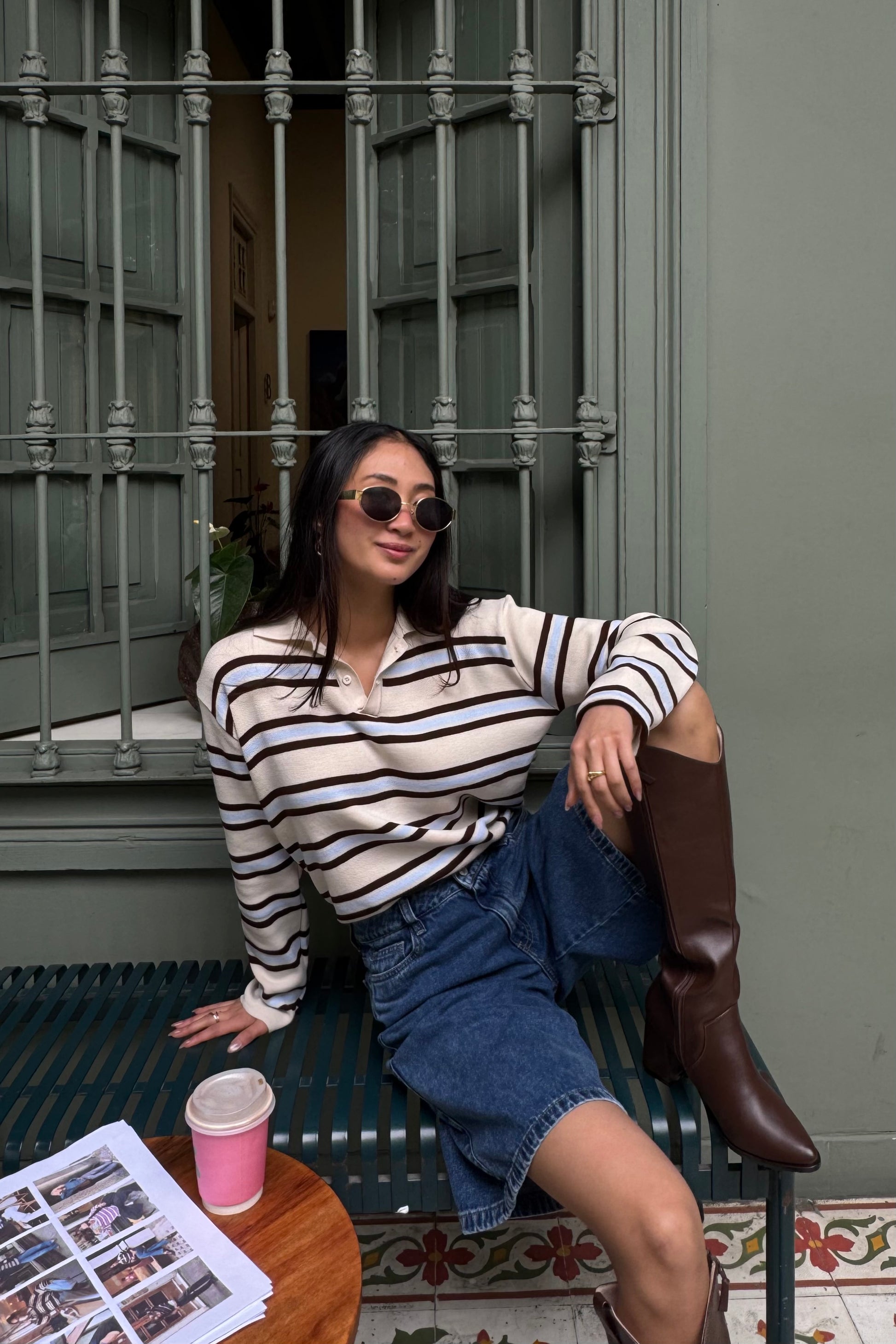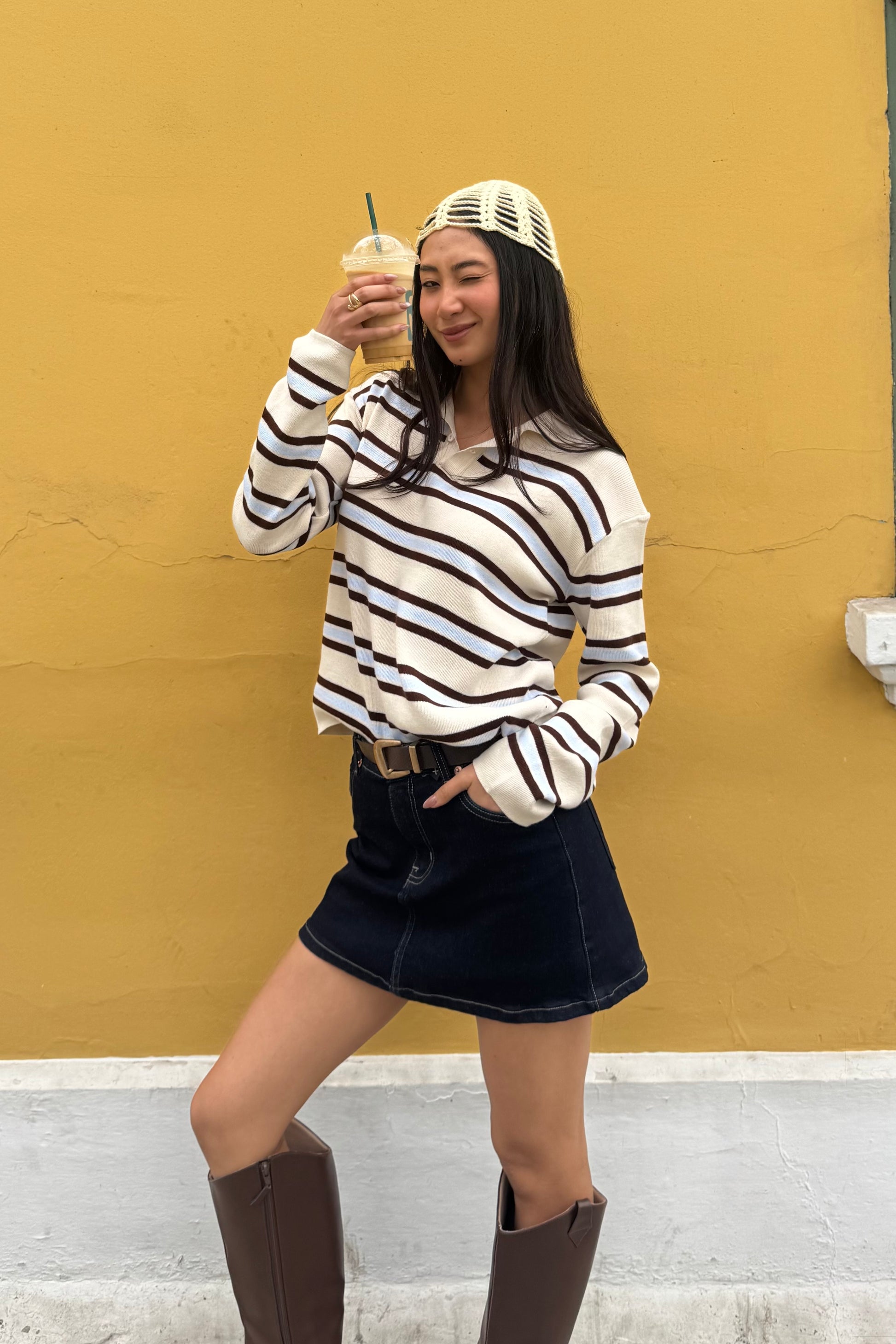 Este sweater de rayas en tacto algodón es de esas prendas que abrigan lo justo y se sienten suaves todo el día 🤎. Tiene un fit relajado que lo hace fácil de combinar, ya sea con jeans o pantalones más clásicos. Es de esas piezas que te salvan cuando quieres estar cómoda, pero con un look que siempre se ve bien.
