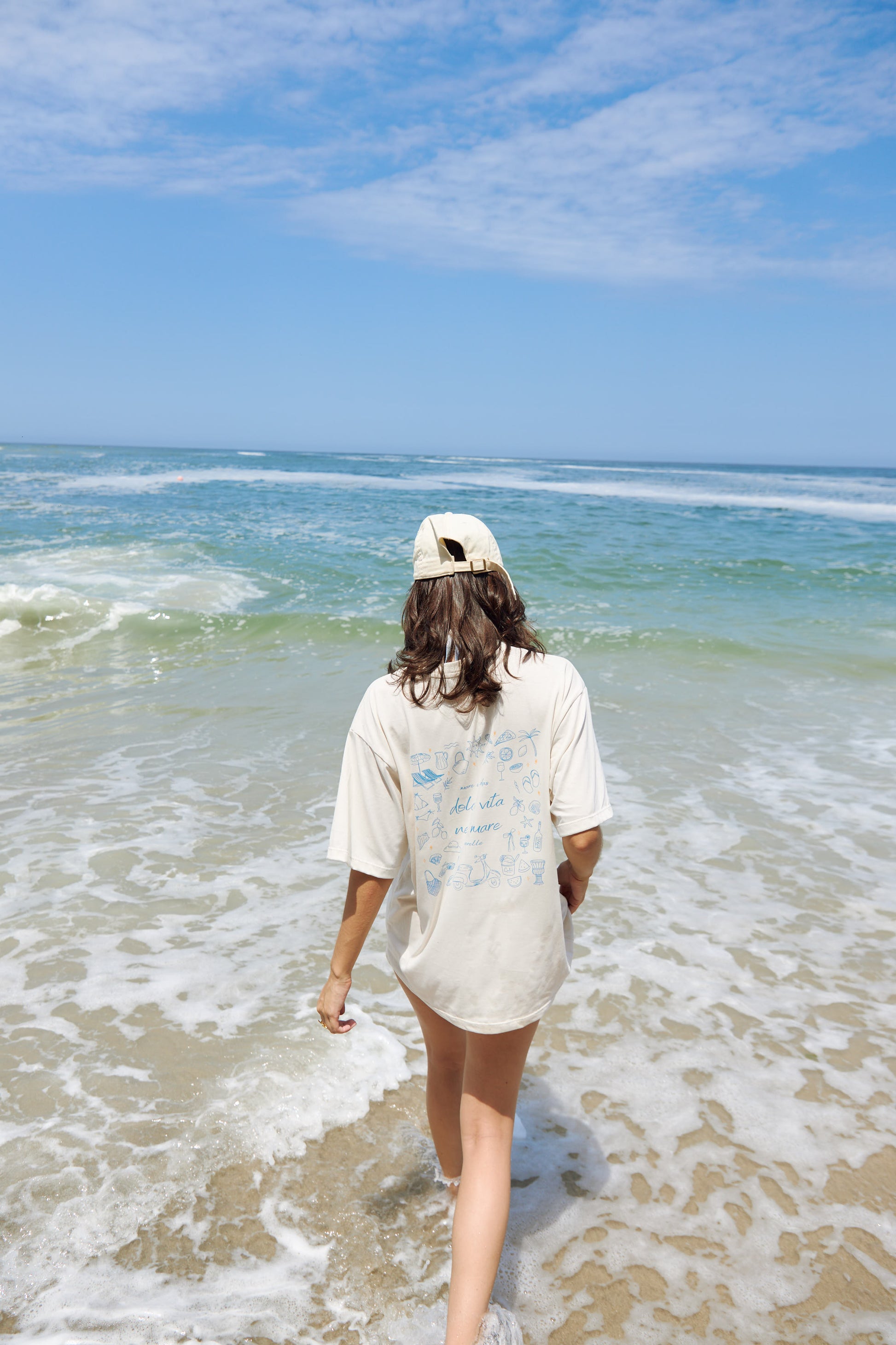 La parte posterior reúne lo mejor del verano y la playa: sombrillas, refrescos, el sol, helados, y lo más icónico de todo, ¡una Vespa! Un emblema de la libertad y el estilo italiano.