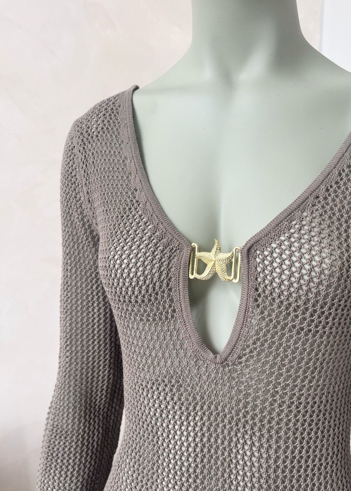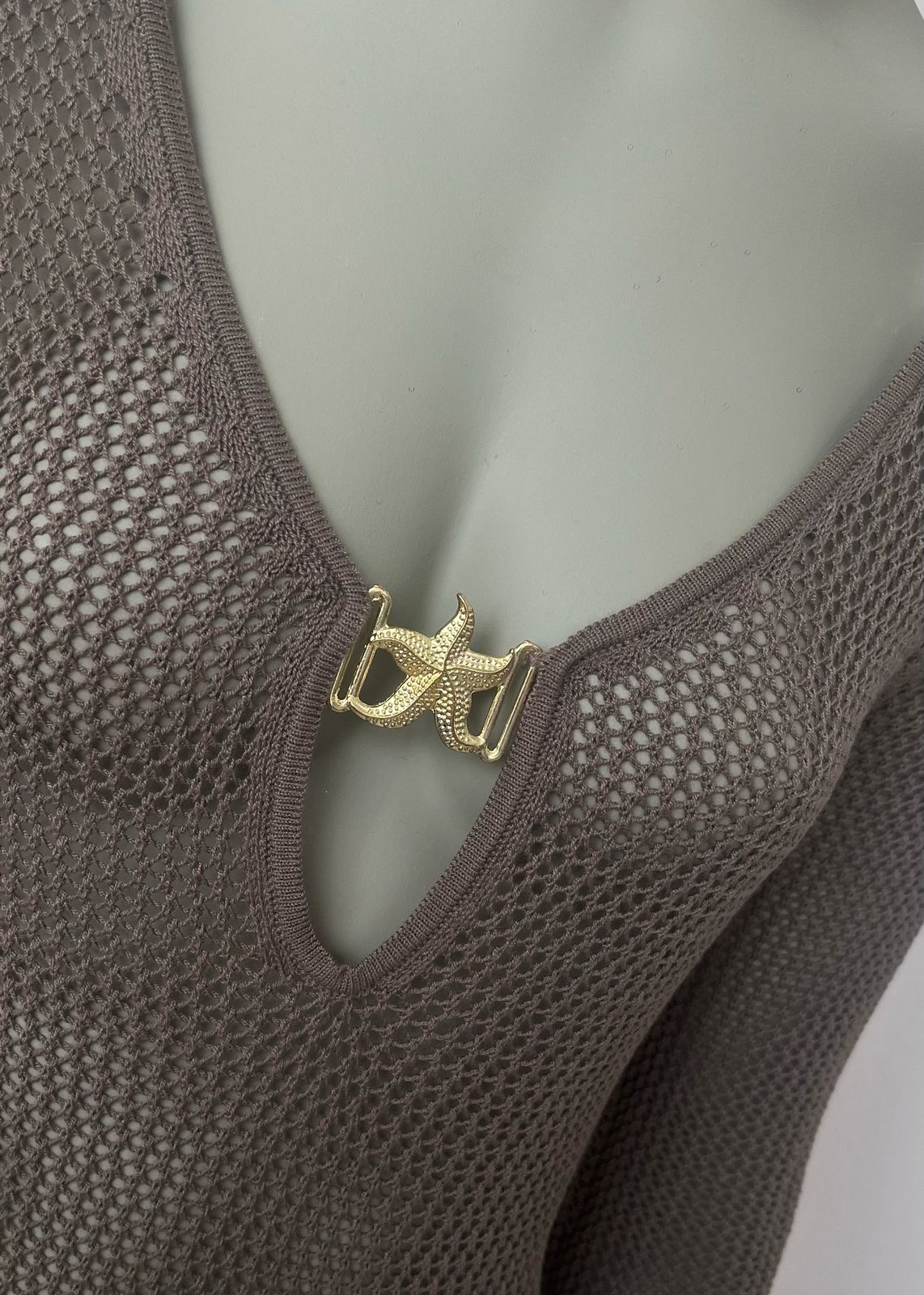 Confeccionado en tejido tacto algodón, con mangas largas acampanadas y el detalle único de un broche dorado que le da ese toque especial a esta pieza.