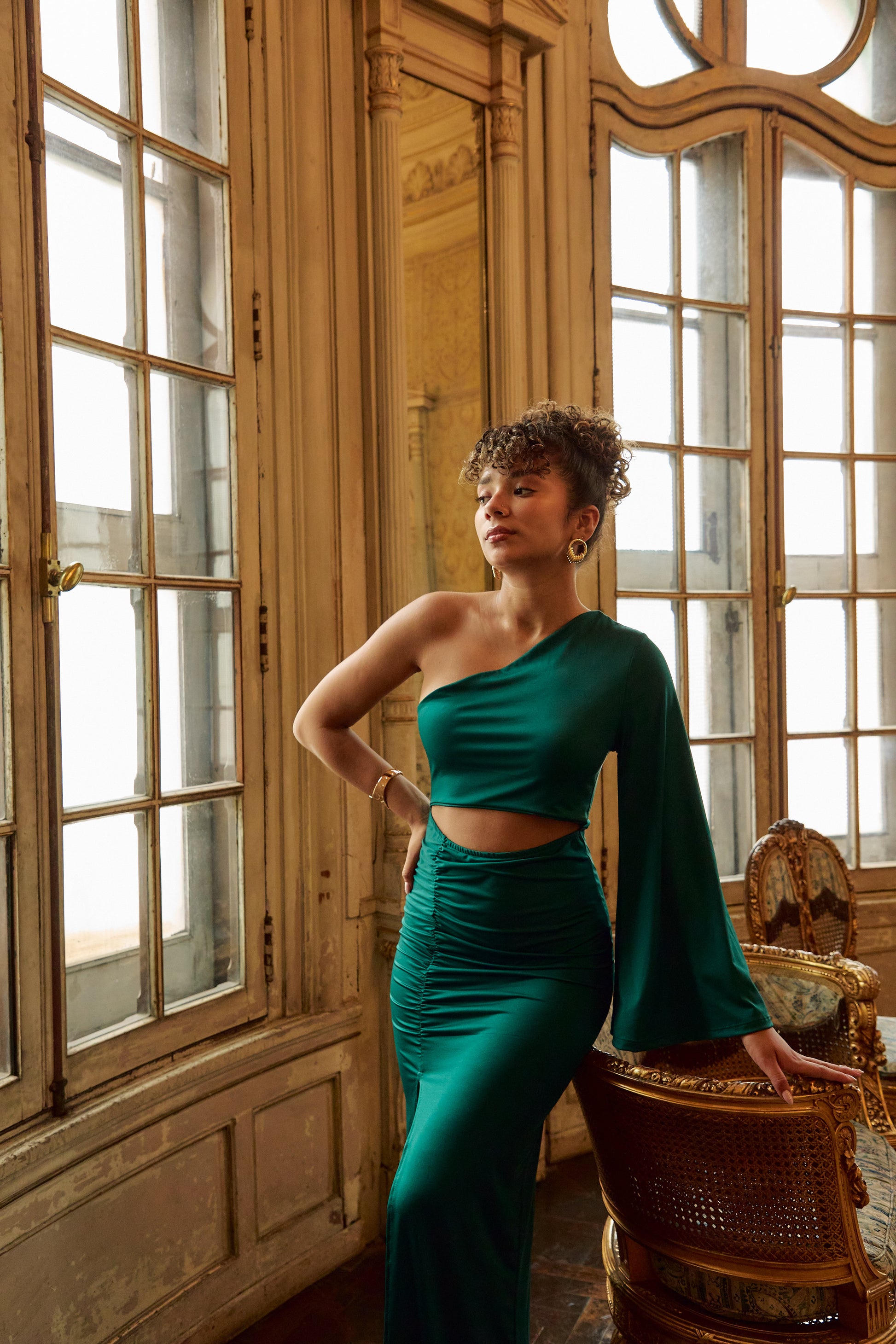 De corte asimétrico en el pecho, con una manga forma campana y una abertura en la pierna.